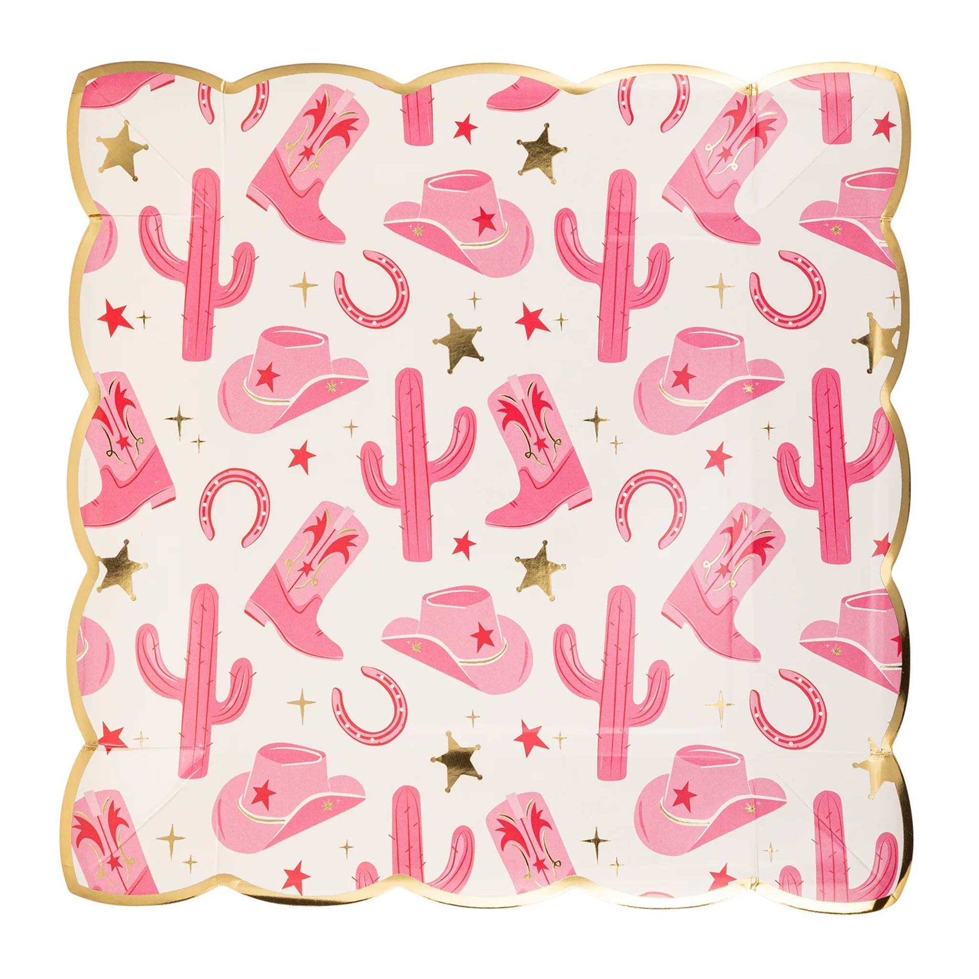 Yee-haw! Saddle up for a wild meal with our Pattern Paper Plate. Featuring a playful cowgirl pattern in pretty pink and shiny gold foil, this plate will add a touch of fun to any party. Round up your friends and get ready to chow down!