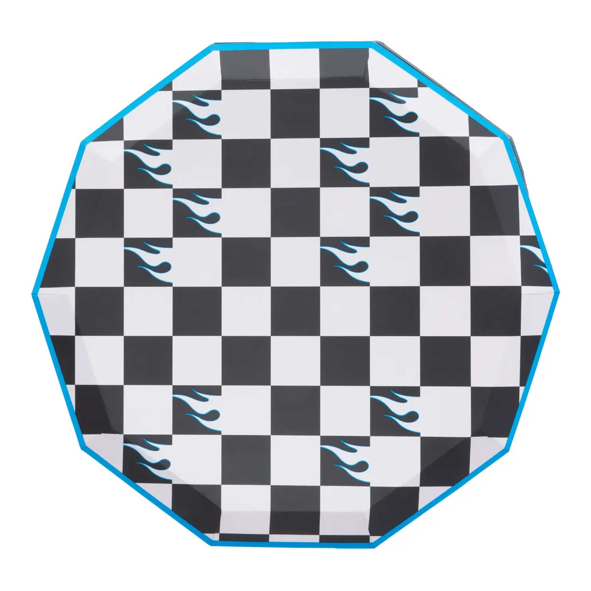 Fuel the fun with these bold black-and-white flame checker plates, featuring a vibrant blue rim. Perfect for race car-themed parties and high-energy celebrations!