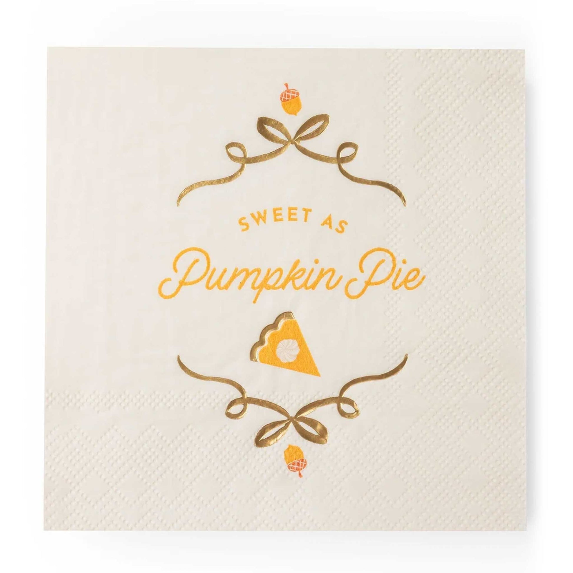 Add a festive touch to fall gatherings with these fun and cheeky Sweet As Pumpkin Pie cocktail napkins. Featuring a pumpkin pie illustration, gold foil accents, and seasonal flair—perfect for Thanksgiving, Friendsgiving, or autumn entertaining.